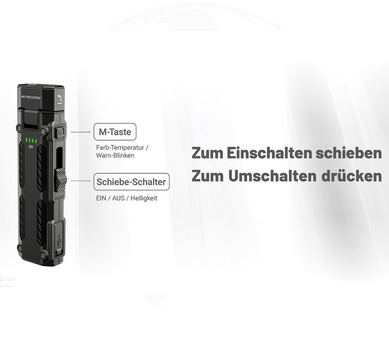 Über den seitlichen Schiebe-Schalter lassen sich die drei Leuchtstufen schnell und einfach auswählen. Mit dem separaten MODE-Knopf wechselst du bequem zwischen den Lichtfarben. Zusätzlich steht ein ULTRALOW-Modus mit 1 Lumen zur Verfügung – perfekt für maximale Laufzeiten oder diskrete Beleuchtung. Die integrierte ATR-Temperatursteuerung überwacht kontinuierlich die Wärmeentwicklung und sorgt für eine sichere, konstante Leistung sowie eine möglichst lange Brenndauer im High-Mode.