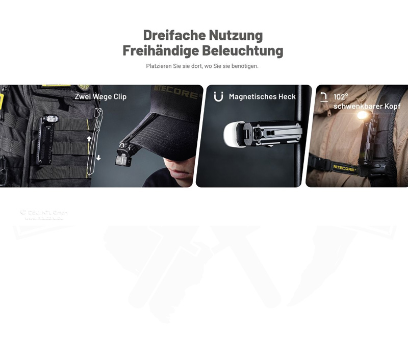 - Besonderheiten: Magnetfuß, Winkellampe, TIR-Linse, Zwei-Wege-Clip