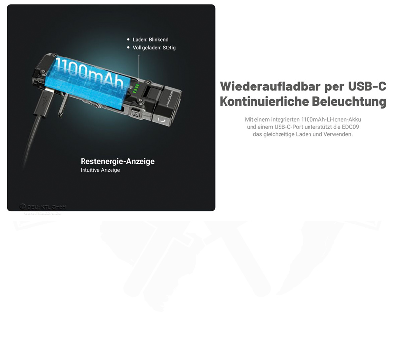 Das zweiteilige Edelstahlgehäuse mit PVD-Beschichtung verleiht der Nitecore EDC09 eine hohe Widerstandsfähigkeit und eine edle, technische Optik. Die Lampe ist nach IPX6 wasserdicht, bruchsicher bis 2 Meter und damit bestens für anspruchsvolle Einsätze geeignet. Der integrierte 1100 mAh Li-Ion Akku wird komfortabel über den USB-C-Ladeport geladen und bietet enorme Laufzeiten von bis zu 250 Stunden im Ultralow-Modus. Eine Akkustandanzeige informiert dich jederzeit über den aktuellen Ladezustand.