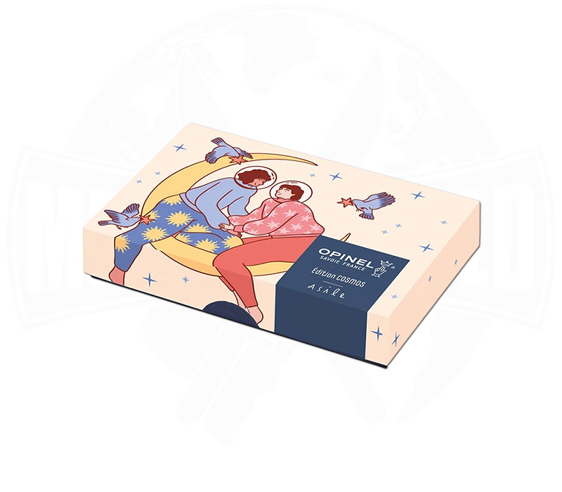 Mit der Cosmos Edition Asile wird das klassische Opinel N°08 zur Leinwand für ein poetisches Gleichgewicht aus Tag und Nacht, Traum und Wirklichkeit. Das Motiv zeigt keine Gegensätze, sondern ein bewusstes Miteinander zweier gleichwertiger Figuren, eingebettet in eine kosmische Szenerie voller Ruhe, Symbolik und Wärme.