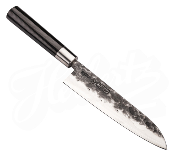Das Blacksmith Santoku ist ein extrem edles Kochmesser, welches durch sein exklusives Äußeres schon auf den ersten Blick überzeugt. Die ca. 18 cm lange Klinge aus AUS-8 Stahl bringt mit seiner schwarzen Hammerschlag-Oberfläche eine gewisse Schmiedeoptik rein und verleiht dem Küchenmesser so einen noblen Charakter. Abgezogen wird die Klinge per Hand, wodurch sie extrem scharf ist. Typisch für den japano-Stil sind die Griffe in Maru-Form, welche aus Micarta und Edelstahl bestehen und für ein tolles Handling sorgen. Nach der Übersetzung steht Santoku für die drei Tugenden in der Küche, die sich in den Zubereitungen von Fleisch, Gemüse und Fisch wiederfinden. Das Santoku gilt also als Allzweckmesser, welches durch die zweiseitig angeschliffene Klinge einen hervorragenden Job macht. Geliefert wird es in einer sehr ansehnlichen Box, perfekt als Geschenk geeignet.