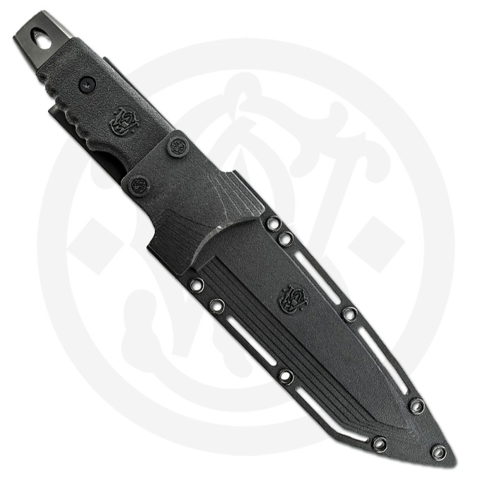 Das Smith & Wesson Tantomesser SW7S ist in Full-Tang-Bauweise hergestellt. Das kräftige Gürtelmesser besitzt eine beschichtete Tantoklinge mit Teilwellenschliff. Damit lassen sich auch Schnüre oder faserige Materialen durchtrennen. Der 13,7 cm lange Griff mit Fingermulden und S & W Pressung ist aus gummiertem Kunststoff gefertigt und liegt sicher in der Hand. Am Griffende befindet sich ein Metallabschluss, an dem eine Fangschnur befestigt werden kann. Die Kunststoffscheide kann beidseitig getragen werden. So ist das SW7S Messer sowohl für Links- als auch für Rechtshänder gut geeignet.