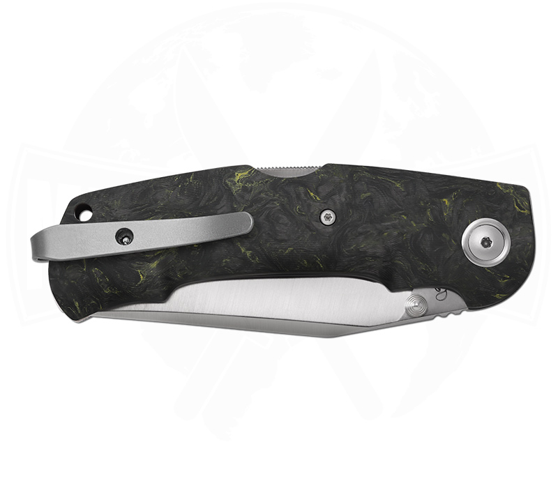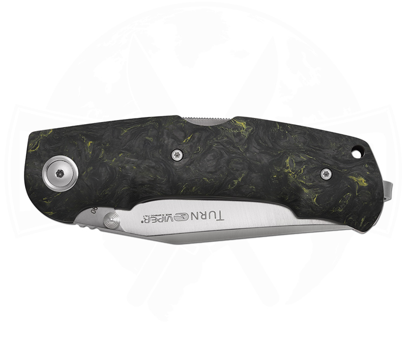 Der gelb durchsetzte, ergonomisch geformte Griff aus Kohlefaser ist das Merkmal des Turn CF Yellow. Das Turn gibt es mit unterschiedlichen Griffschalen. Die Klinge des Turn besteht aus M390-Stahl, die mit dem Daumenpin in Position gebracht wird. Arretiert mit einem stabilen Backlock klappt die Klinge bei der Nutzung nicht ein. Am Griffende befindet sich eine Fangriemenöse, an der du dein Messer mit einem Lanyard individualisieren kannst oder es für den Transport anhängen kannst. Die Turn-Reihe sind elegante Messer, aber das Turn CF Yellow ist unserer Meinung nach das schönste dieser Reihe.